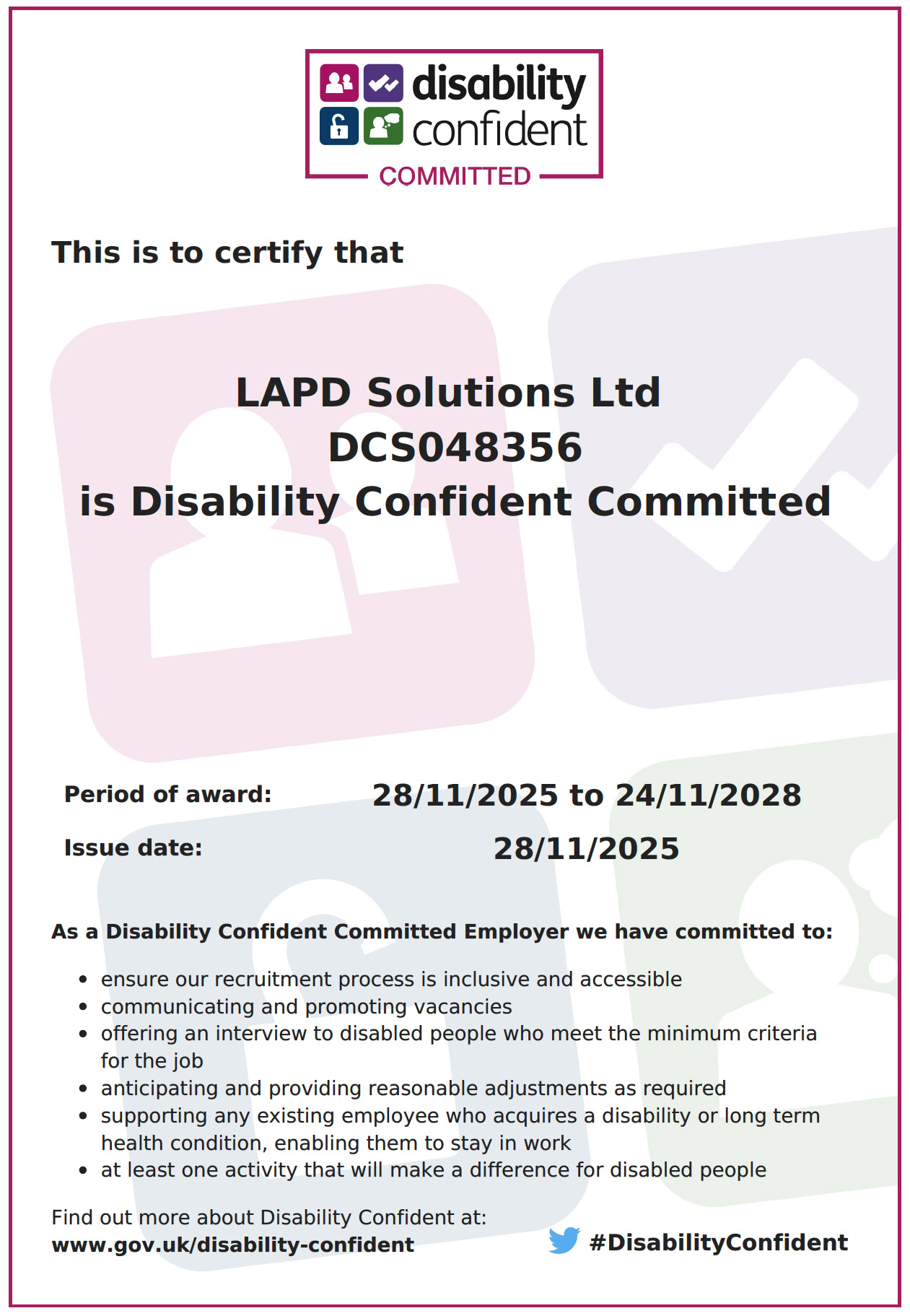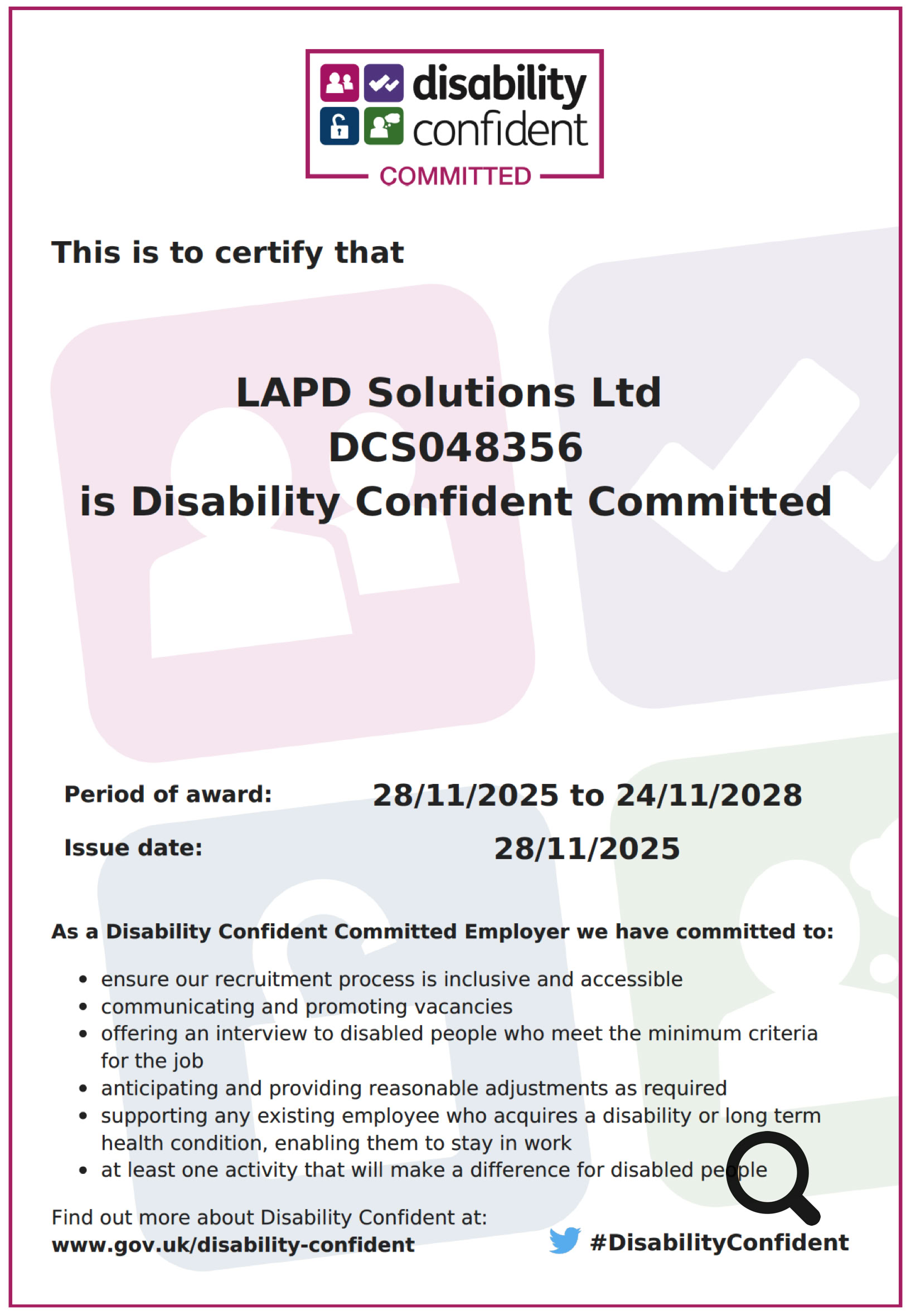 We are proud to have signed up to the Disability Confident Scheme as shown by the certificate below